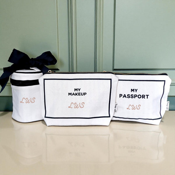 Dieses Produkt kann mit einem Monogramm versehen werden. Die Produkte, die monogrammiert werden, sind Makeup-Tasche, Reisepass-Tasche mit maximal 8 Buchstaben und Carry On Liquid Case mit maximal 3 Buchstaben. Für die Platzierung des Monogramms siehe die beigefügten Bilder. Um mehr über Monogramme zu erfahren, klicken Sie hier.