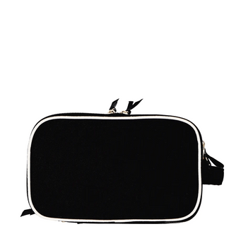 Hecho de algodón natural duradero y forrado con las icónicas rayas en blanco y negro de Bag-all, combina un aspecto atemporal con un diseño práctico. Las elegantes cremalleras doradas están rematadas con tiradores de cinta grosgrain hechos de botellas PET 100% recicladas, añadiendo un toque sostenible. Compacto pero espacioso, cabe perfectamente en tu maleta o bolsa de fin de semana. Personalízalo con un monograma personalizado para crear un estuche de belleza tan único como tú.