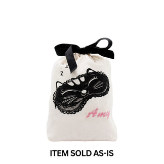 Sleeping Mask Travel Bag with faulty "Amy" pink monogram and a small stain on the side.