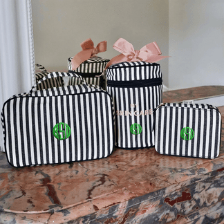 Le tissu en coton rayé signature ajoute une touche chic, tandis que les formes structurées facilitent le rangement à la maison ou dans votre valise. Parfait pour les amateurs de voyage, les routines quotidiennes ou comme cadeau. Ajoutez un monogramme pour une finition personnalisée !