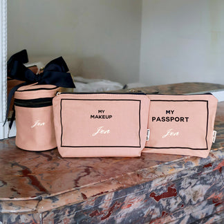 This product can be monogrammed. The products that will be monogrammed are Makeup Pouch, Passport Pouch with a maximum of 8 letters, and Carry On Liquid Case with a maximum of 3 letters. For monogram placement, see the pictures attached. To learn more about monograms click here.