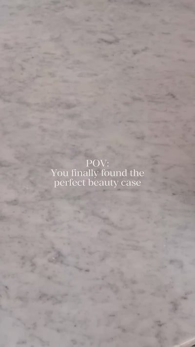 A structured double-sided makeup case designed to organize beauty products in one compact space at home or while traveling. It can also be personalized with a monogram or embroidery. The two separate compartments with mesh pockets, inner pockets, and elastic straps keep makeup, brushes, and skincare items organized, visible, and securely in place. Made from cotton with a structured shape, top handle, and coated lining for easy cleaning and protection during travel.