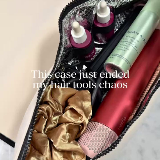 This sleek travel case keeps your styling tools and accessories safe, organized, and ready to go. The built-in mat can hold hot items like a hair iron right after use, while elastic straps keep attachments secure. A zippered compartment fits cords, brushes, and products, and the fold-over flap with snap...read more