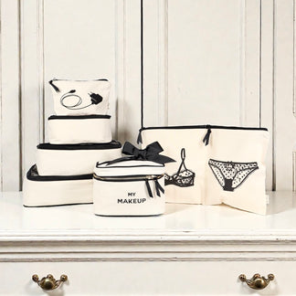 poupe €23 e simplifique a sua rotina de arrumação! O Conjunto Travel Glam 4-Pack é um elegante conjunto de organizadores em algodão natural, projetado para uma ordem sem esforço. Esta coleção indispensável inclui Cubos de Arrumação, um Saco de Lingerie Duplo, a Minha Caixa de Maquilhagem e um Saco para Carregador.